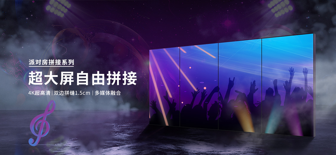 大尺寸拼接屏,超大的尺寸以及自由拼接的灵活性,可组成更大屏幕给人震撼的感觉,主要应用在KTV大包房为主,也可以应用在其它领域,比如:户外广告,公共场所等